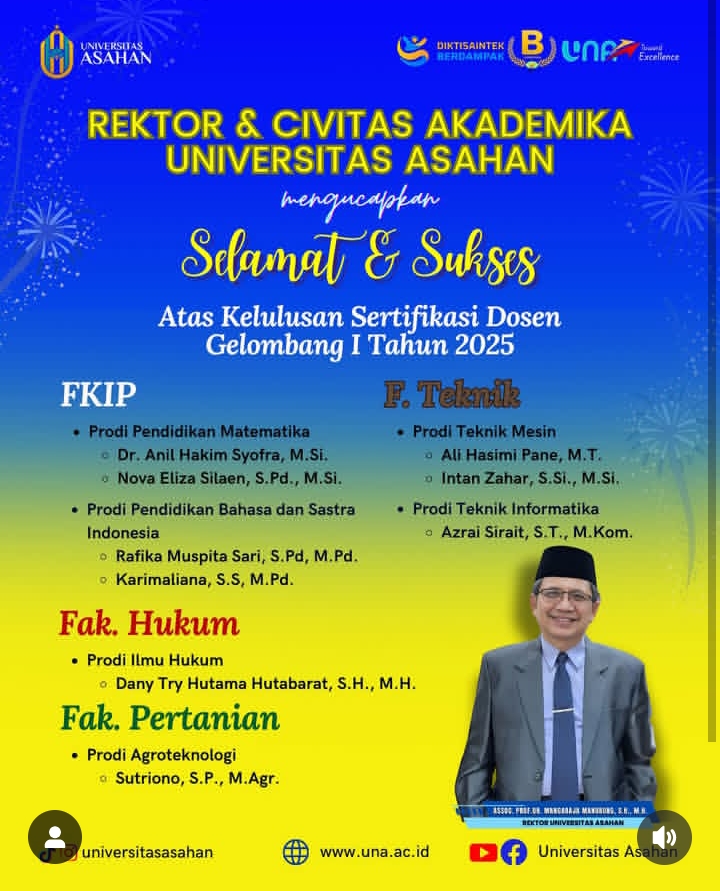 KISARAN-Lembaga Pendidikan Tenaga Kependidikan (LPTK) Universitas Asahan (UNA) terus meneguhkan komitmennya dalam menyiapkan tenaga pendidik profesional yang siap menjawab tantangan zaman. Pada Sabtu (27/09/2025), UNA resmi menggelar Orientasi Peserta Program Pendidikan Profesi Guru (PPG) Guru Tertentu Tahap 3 Tahun 2025 di Hotel Antariksa, Jl. Sei Gambus No.3, Sendang Sari, Kec. Kota Kisaran Barat, Kabupaten Asahan, Sumatera […]